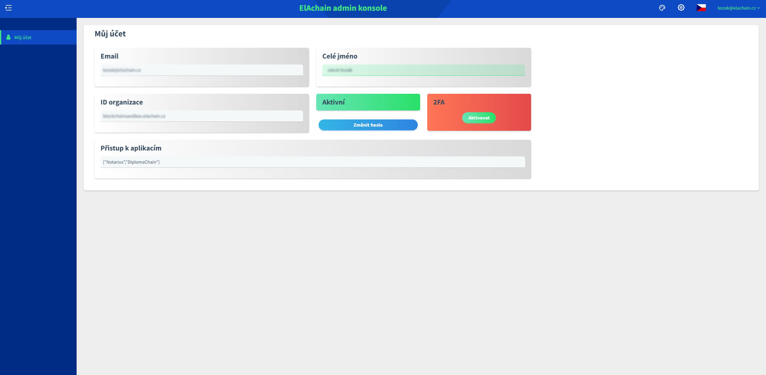 Můžete si zde změnit jméno, změnit heslo nebo zapnout/vypnout 2FA (dvoufázovou autentifikaci). Také vidíte, jestli je Váš účet aktivní a můžete používat aplikace ke kterým máte přístup.