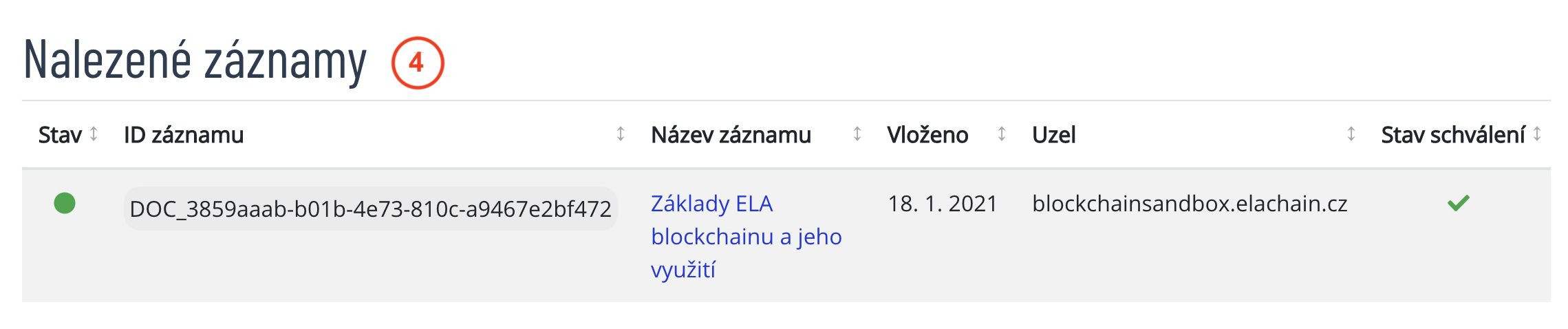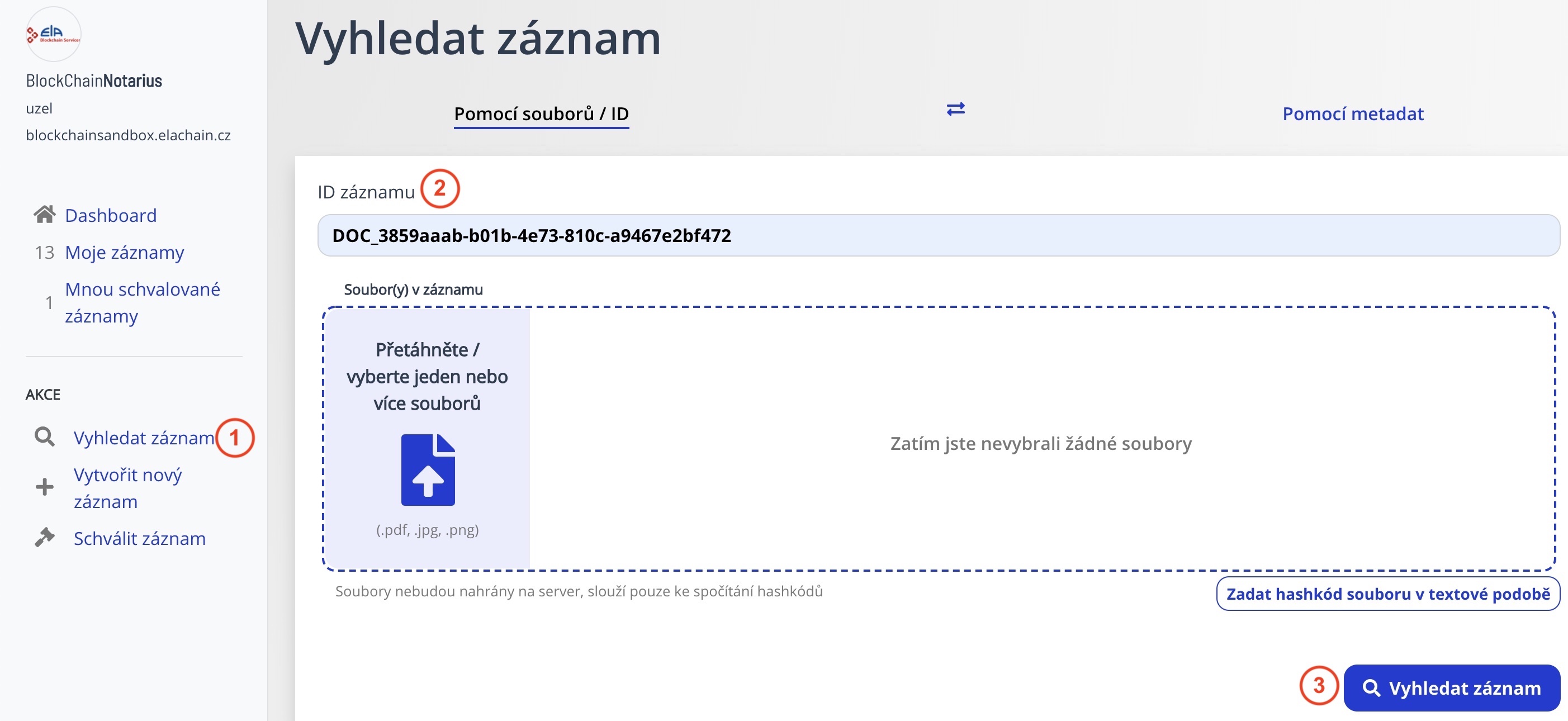 Vyhledání záznamu není totožné s jeho ověřením. Vyhledání záznamu pouze poskytne informaci o tom, zda byl v blockchainu nalezen záznam se zadaným ID. Při vyhledávání se neověřuje hash souboru!