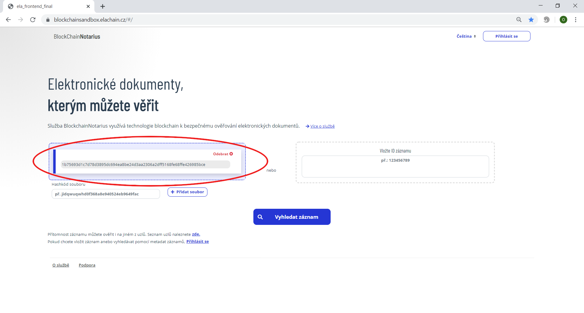 - Klepněte na tlačítko +Přidat soubor . V levém poli se objeví zadaný hash . Pomocí červené ikony Odebrat v pravém horním rohu pole lze hash opět odebrat.