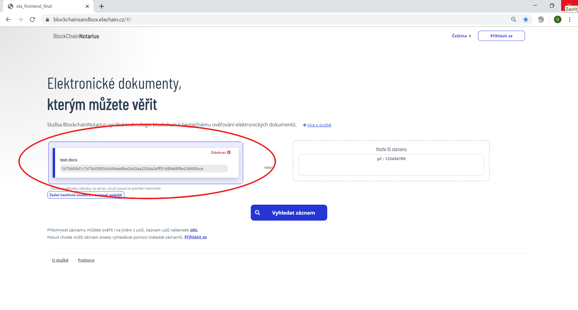 - V levém poli se objeví název souboru a pod ním vypočtený hash . Pomocí červené ikony Odebrat v pravém horním rohu pole lze soubor opět odebrat.