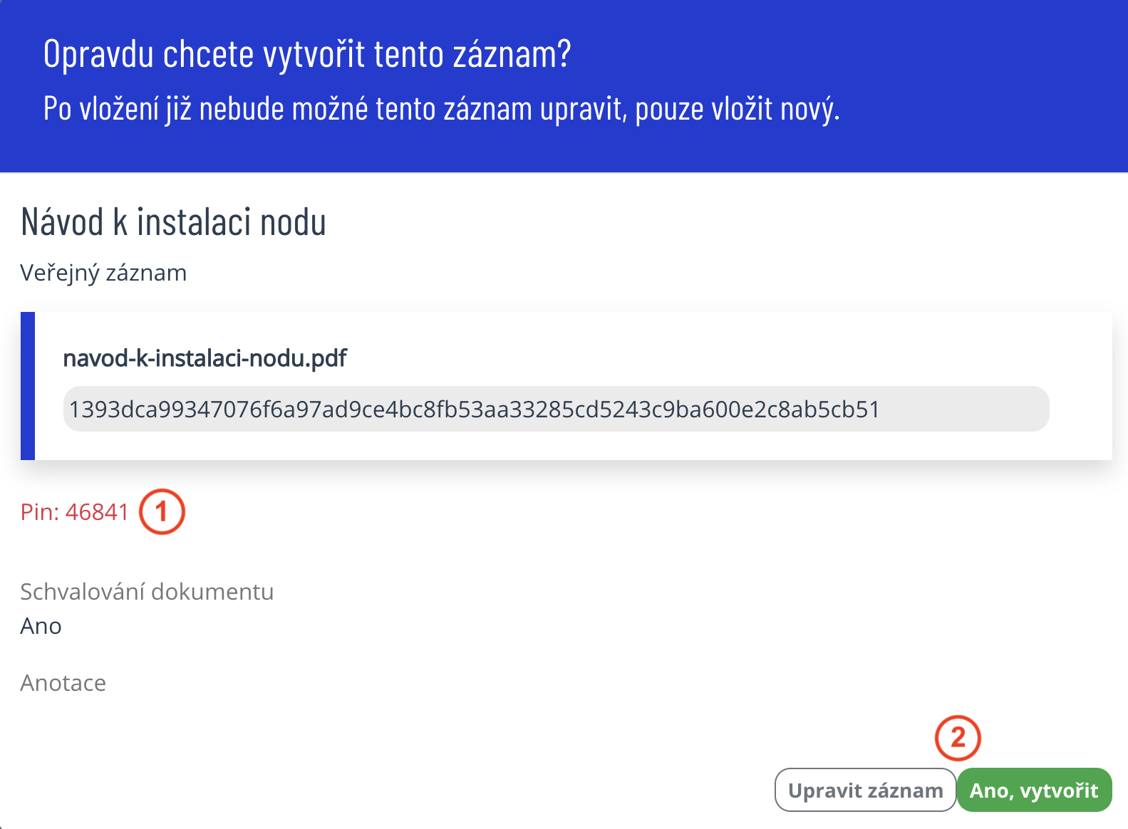 Tím je záznam připraven ke schválení. Zašlete ID záznamu a PIN osobě, která bude záznam schvalovat. V rámci bezpečnosti je doporučováno ID záznamu zasílat e-mailem a PIN pomocí SMS zprávy.