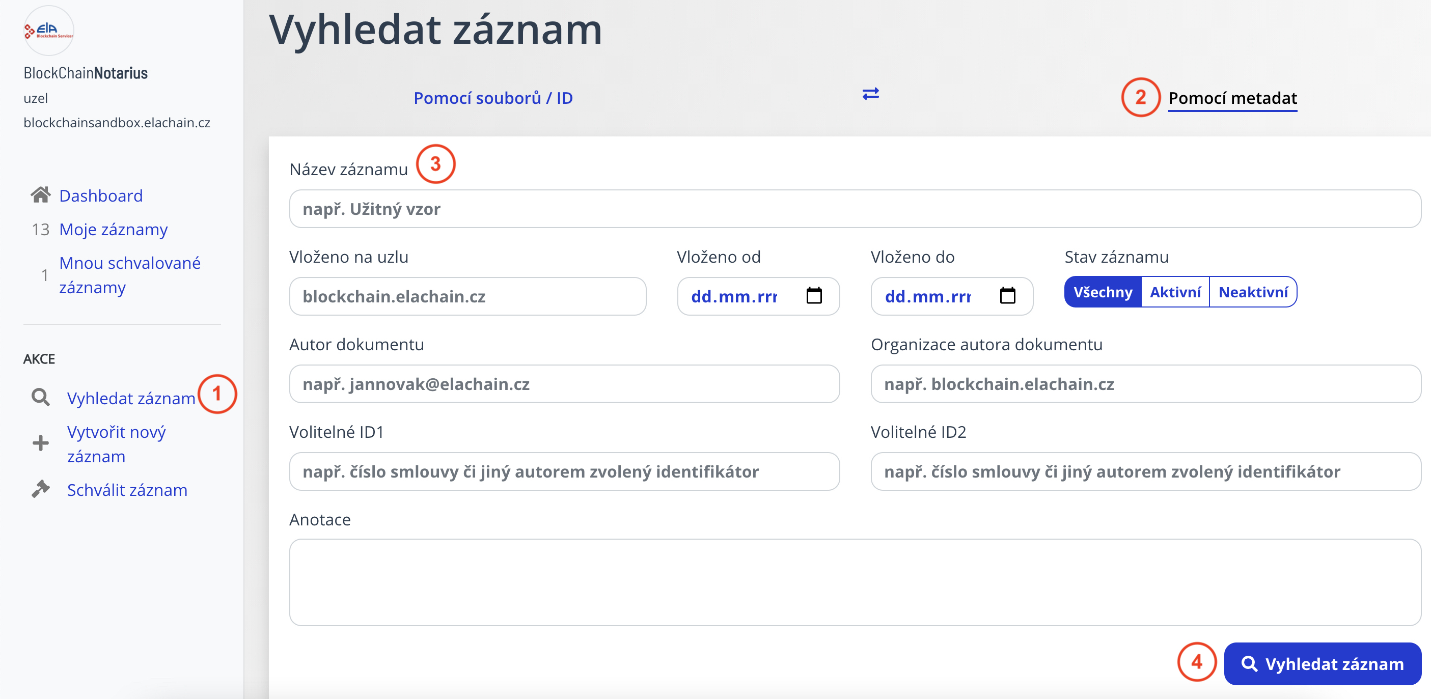 Vyhledávání záznamu není totožné s jeho ověřením. Vyhledávání záznamu pouze poskytne informaci o tom, zda byl v blockchainu nalezen záznam se zadanými metadaty. Při vyhledávání se neověřuje hash souboru!